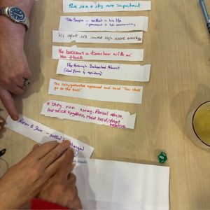 The leader of today’s workshop was Jackie from Jacqson Diego and she started by asking us to go though a series of warm-up exercises. Then she gave each of us a coloured pen with the instruction that no-one else on the table we sat at was to have a pen of the same colour. A simple way to encourage us to mix. A couple more warm-up activities then Jacquie asked us to discuss our earliest memories of books that were important to us. R started by telling us that her choice was ”My Naughty Little Sister”. C chose “Heidi” by Johanna Spyri. Oh yes! I could not get enough of Heidi and I also read “Heidi Grows Up” and “Heidi’s Children”. Of course A.A.Milne’s name came up, but I do not recall who it was who chose “One Hundred Acre Wood”. And was it the person on my left who mentioned “Black Beauty” by Anna Sewell? I definitely would find it easier to remember names if we wore name badges! RR’s choice was “Anne Frank’s Diary” – a much more sombre and serious, yet inspiring true story. M explained her choice was “Thumbelina” and we chatted for a while about how dark Fairy Tales could be.Then S told us about “Tom’s Midnight Garden”. Delving into depths of memory stirs up images of more books but Jacqui moved the session on and gave us each a piece of paper, instructing us to divide it into eight sections. We were to select a story and write down the basic outline in eight parts. At this stage we did become a tad confused. Some thought that we were supposed to take one piece of paper, passing it round the table to each add a section. Others thought that each person had to write out their own story. It did not actually matter. What Jacqueline needed was stories in eight strips which were then torn up, shuffled and re-allocated to each table. We had to arrange those new strips into an order to ‘tell a story’. That was fun! We arranged and fe-arranged, with much discussion.Eventually we settled on the order and it was time for lunch. Jacqui explained that after lunch we would be illustrating our stories in some way. Regrettably, I had to miss the afternoon session owing to a prior engagement. But I knew how I was going to ‘illustrate’ our story. I was going to write it down.